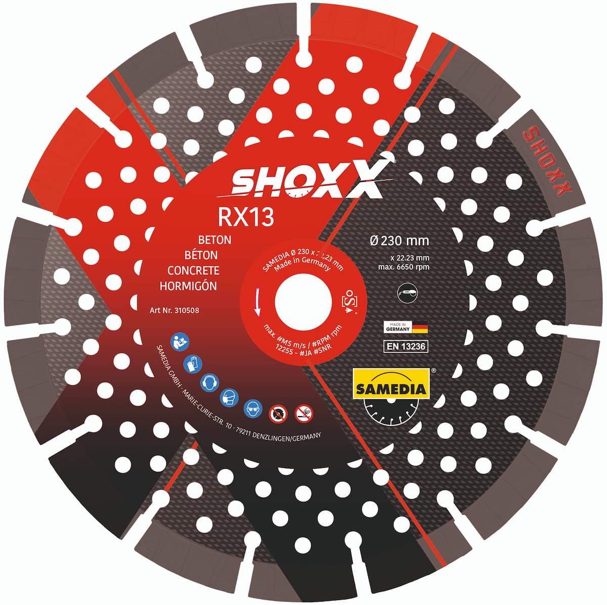 Safety information : the SHOXX RX13 diamond blade from SAMEDIA is compliant with the EN 13 236 european norm.